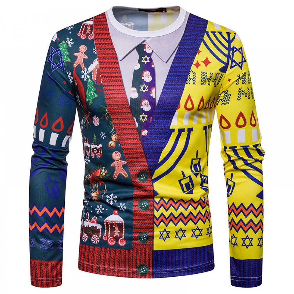 New 3D Personality Fake Two-Piece Printing Fashion Men's Christmas Long-Sleeved T-Shirt